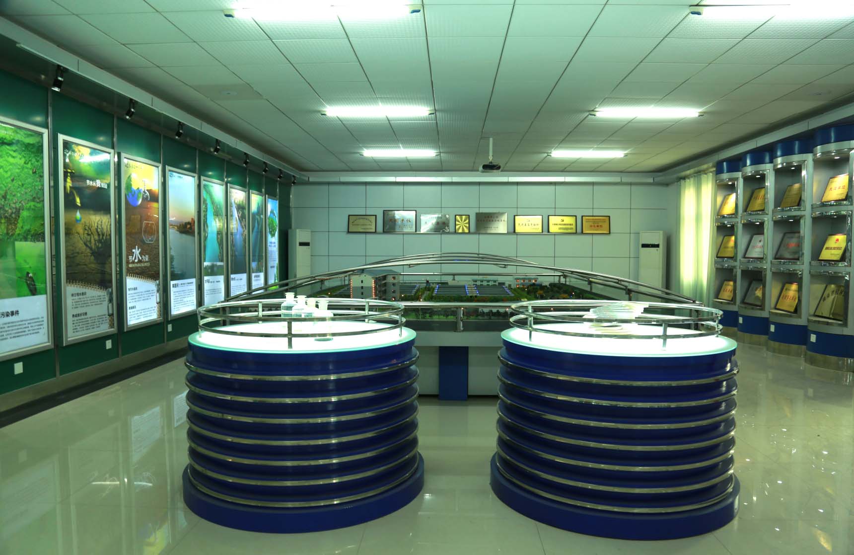 展覽廳分為四個(gè)部分,一是水環(huán)境保護(hù)的宣傳,二是平面布置實(shí)體模型,三是公司黨委歷年獲得的部分榮譽(yù)展示,四是進(jìn)出水樣。